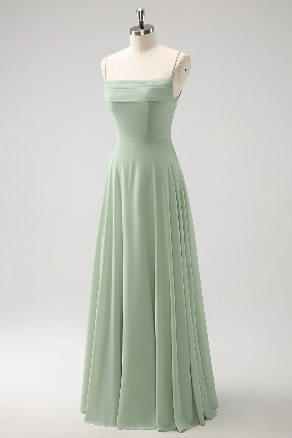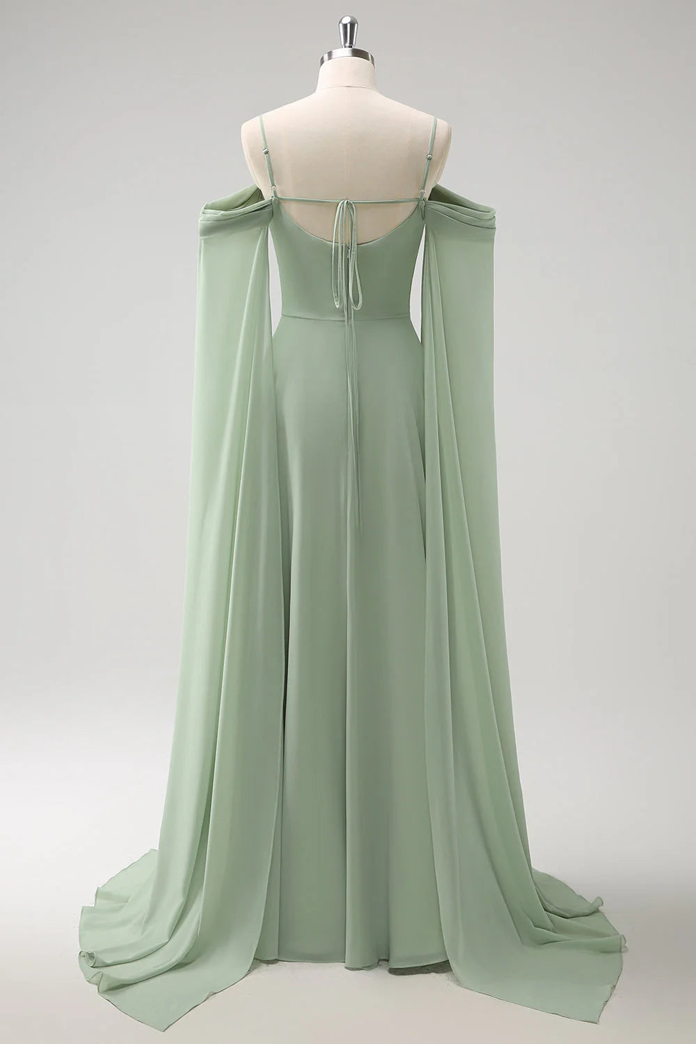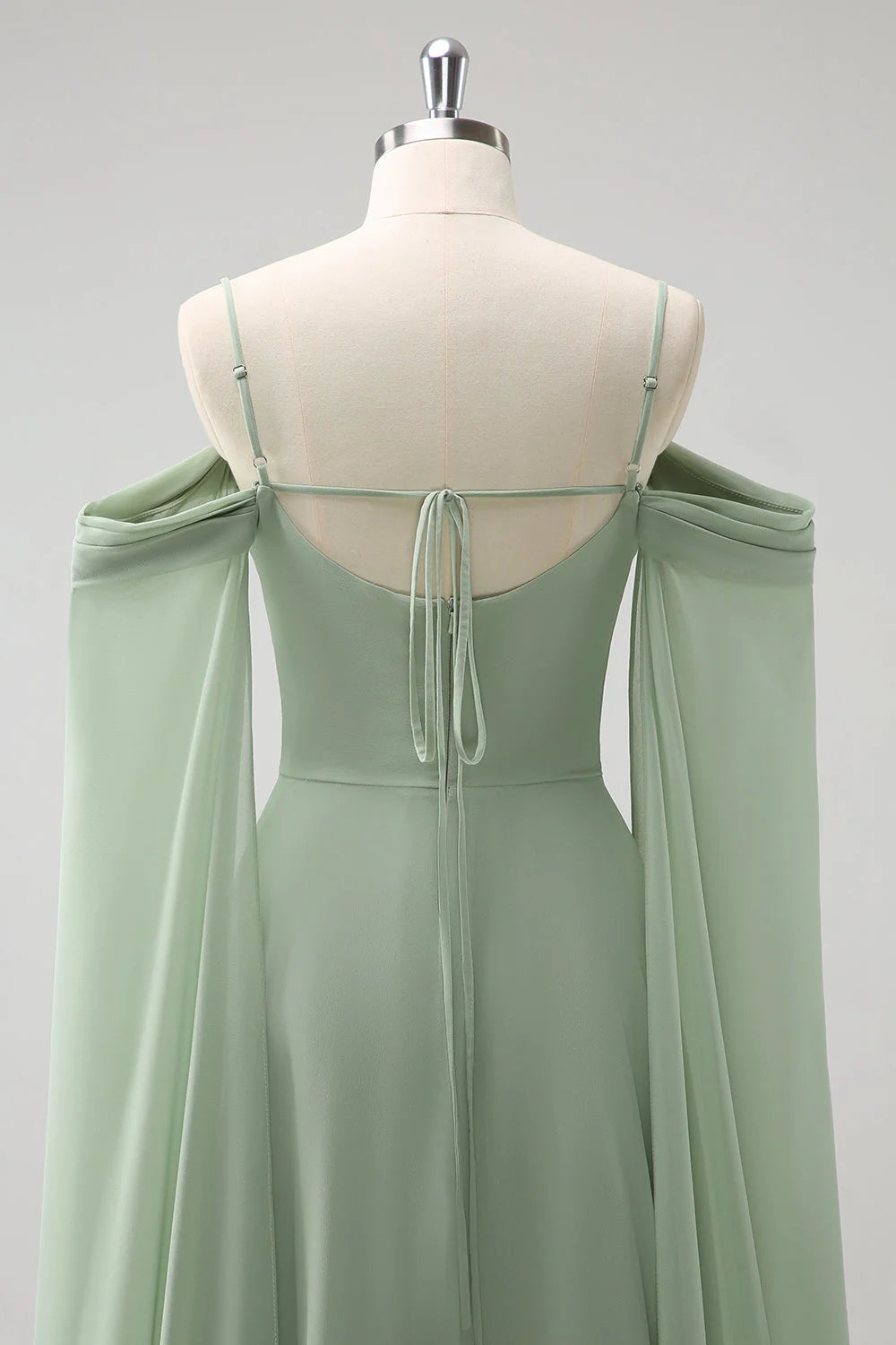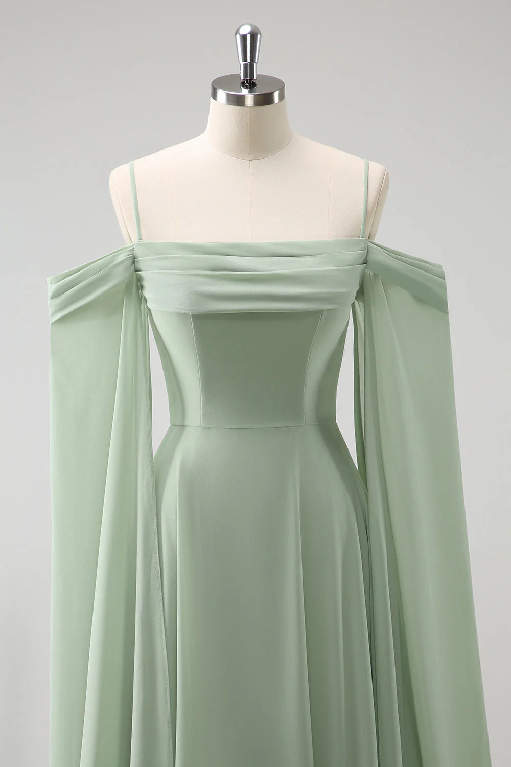 Light Green Cold Shoulder Detachable Sleeves A-Line Chiffon Long Bridesmaid Dress