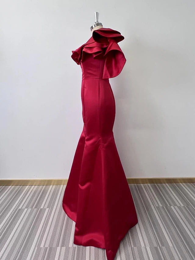 Mermaid Evening Gown Corsets Dress Formal Wedding Guest Floor Length Sleeveless One Shoulder Taffeta with Ruffles Shouder Flower Masquerade Dress