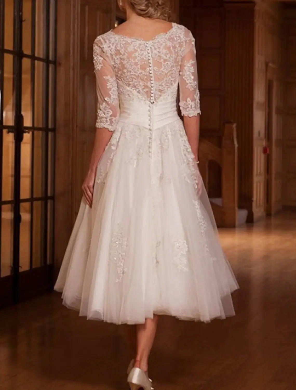Reception Vintage 1940s / 1950s Little White Dress Bridal Shower Dresses Wedding Dresses A-Line Illusion Neck 3/4 Length Sleeve Tea Length Lace Bridal Gowns With Appliques